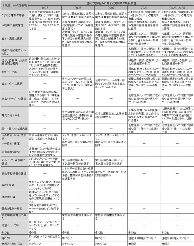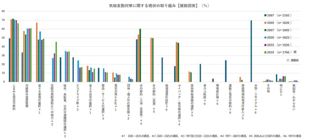 【1997の質問内容】 毎日の暮らしの中でのちょっとした工夫で地球温暖化の防止に貢献することができますが,あなたは,ふだんの生活で何か気をつけていることがありますか。【2005の質問内容】 家庭で行う地球温暖化対策として、あなたができると思うことは次のうちどれでしょうか。【2007の質問内容】 家庭でできる地球温暖化対策について、あなたが実際に取り組んでいる対策は次のうちどれでしょうか。【2020~2025の質問内容】 「脱炭素社会」の実現に向け、あなたが日常生活の中で、現在、取り組んでいることは何かありますか。  ※2020は別項で「積極的に取り組みたい」、「ある程度取り組みたい」と答えた方への質問