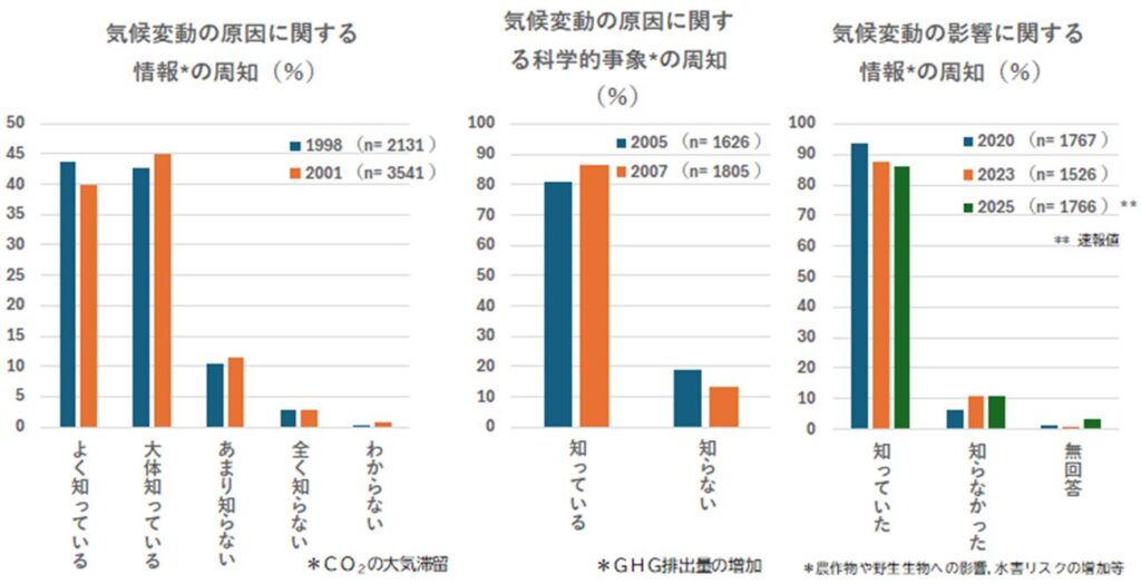 その結果を見ると、いずれの調査でも8割以上の人が「知っている/知っていた」と答えており、気候変動に関する基礎的な情報は十分浸透しているといえます。