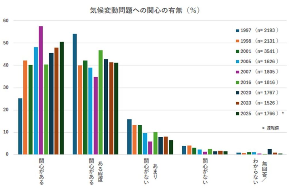 【1997の質問内容】 近年,石炭や石油などの消費により排出される二酸化炭素の量が急速に増加して空気中に溜まりつつあるため,地球の温度が徐々に上昇し,問題となっています。あなたは,この地球温暖化問題について関心がありますか。【1998~2020の質問内容】 あなたは、地球の温暖化、オゾン層の破壊、熱帯林の減少などの地球環境問題に関心がありますか。それとも関心がありませんか。  ※1998,2001は「地球温暖化」と「オゾン層の破壊」の順序逆【2023、2025の質問内容】 気候変動とは、人間活動に伴って発生する二酸化炭素などの温室効果ガスが増えることによって地球の気温が上昇する「地球温暖化」や、自然の要因などによって気温や降水量などが変動することをいいます。あなたは、気候変動が引き起こす問題に関心がありますか。