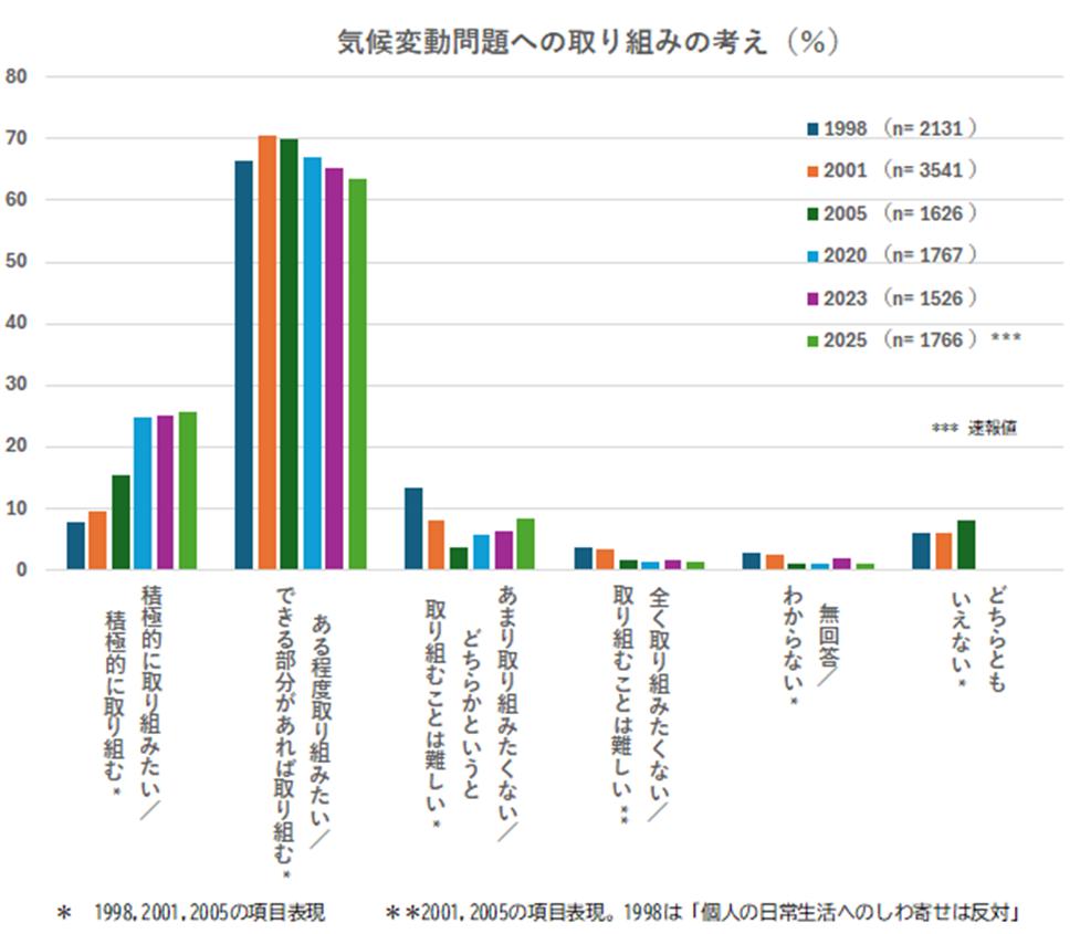 【1998及び2001の質問内容】 あなたは,地球温暖化防止のため,個人の日常生活における取り組みについて,どのようにお考えになりますか。【2005の質問内容】 家庭等で行う地球温暖化対策について、お伺いします。あなたは、地球温暖化防止のための個人の日常生活における取り組みについて、どのようにお考えになりますか。【2020~2025の質問内容】 「脱炭素社会」とは、人間の活動による温室効果ガスの排出量と森林などによる吸収量が等しくなり、排出実質ゼロとなる社会をいいます。あなたは、「脱炭素社会」の実現に向け、一人一人が二酸化炭素などの排出を減らす取組について、どのようにお考えですか?