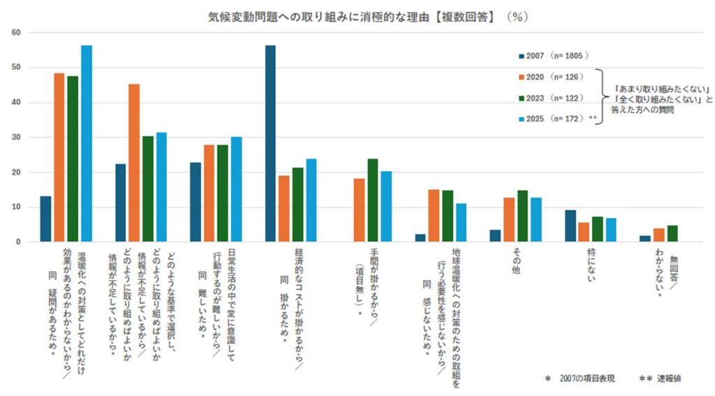 【2007の質問内容】 先ほどお見せした地球温暖化対策のうち、あなたが実際に取り組んでいない対策について、取り組んでいない理由は何ですか。  ※2007年は調査員による個別面接聴取により調査を行っている。【2020~2025の質問内容】 (「あまり取り組みたくない」、「全く取り組みたくない」と答えた方へ)取り組みたくない理由は何ですか。