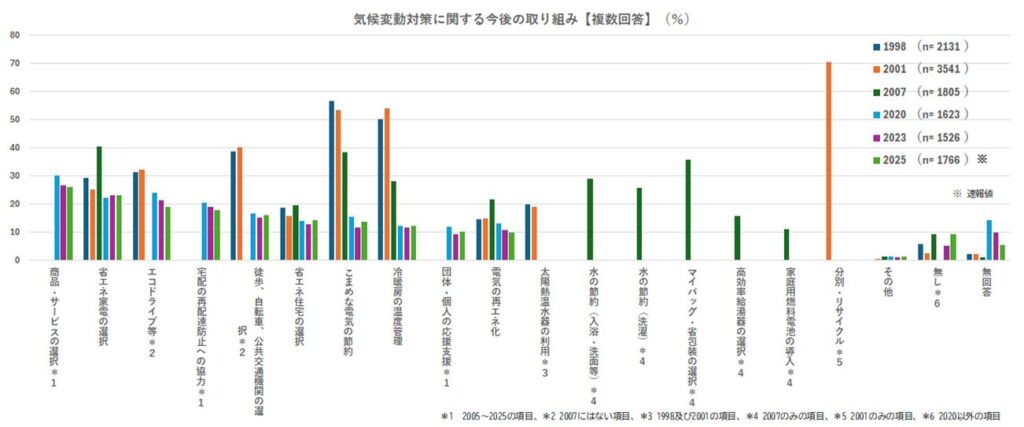 【1998及び2001の質問内容】 現在はエネルギー大量消費型の生活スタイルといわれていますが,地球温暖化防止のためには,あなたは個人の生活スタイルをどのように変えるべきだと思いますか。【2007の質問内容】 家庭でできる地球温暖化対策について、あなたが取り組みたい対策は次のうちどれでしょうか。【2020~2025の質問内容】 「脱炭素社会」の実現に向け、あなたが日常生活の中で、今後、新たに取り組んでみたいと思うことはありますか。  ※2020は別項で「積極的に取り組みたい」、「ある程度取り組みたい」と答えた方への質問