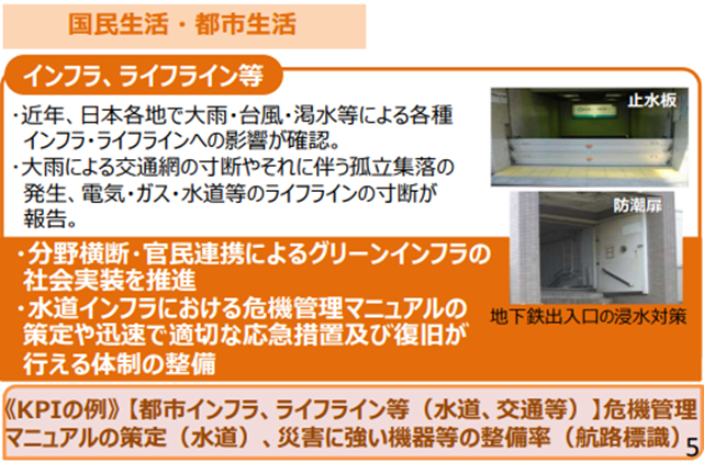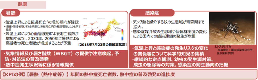 2023年に一部更新された国の「気候変動適応計画」では、報告書で評価された7分野ごとに具体的な適応策が示され、到達目標となるKPIも設定されています。