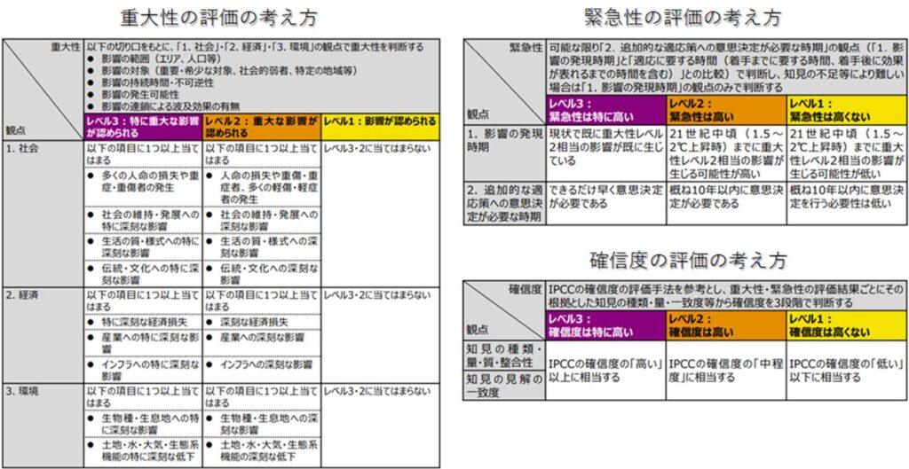 評価における気候変動影響の「重大性」とは、社会・経済・環境にどの程度大きな影響があるのかを示しています。影響の広がりや持続時間、不可逆性(元に戻らないかどうか)や影響の連鎖による他分野への波及などを踏まえて、レベル1~3の3段階で整理されています。
