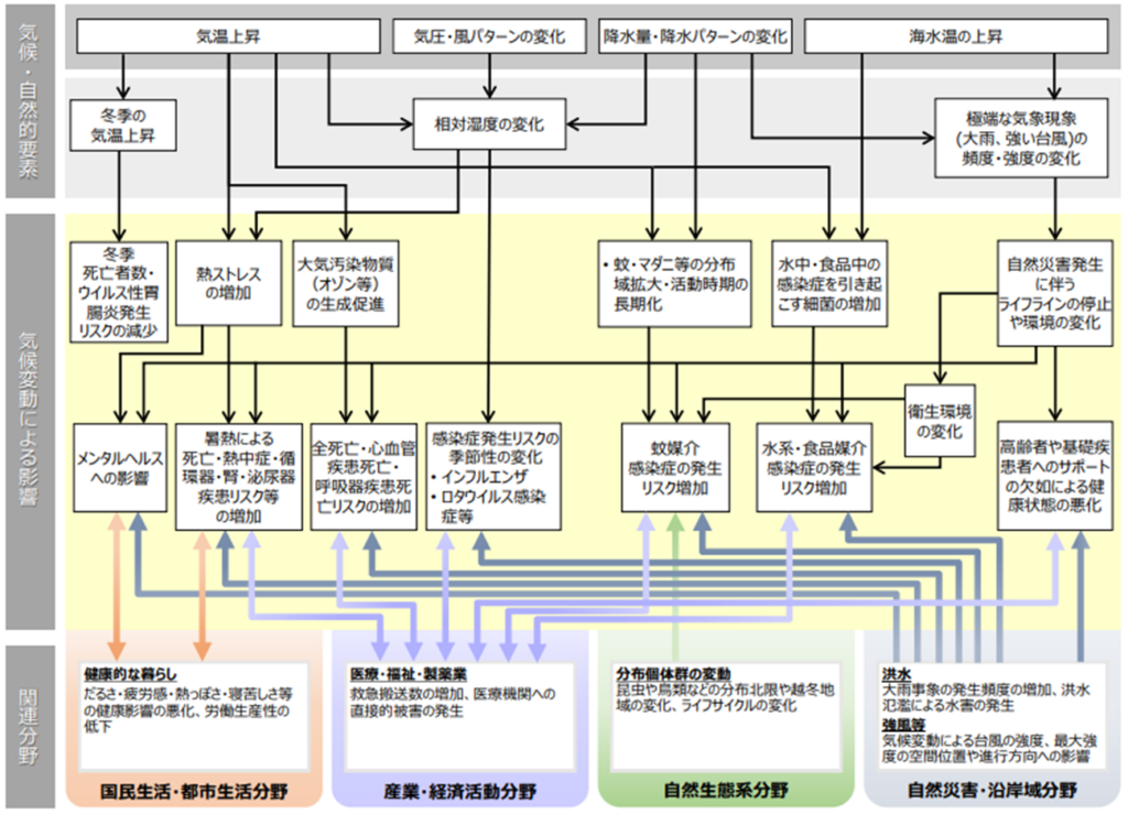 気候変動により想定される影響の概略図(例:健康分野)