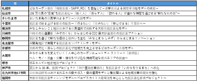 2025年9月時点で、大都市(政令市)に該当する先行地域は14件となっています。タイトルを見ると、いずれも各都市の地域脱炭素化イメージが表現されていますが、特に横浜市、川崎市、静岡市、名古屋市、大阪市、神戸市などは、対象エリアの名称・特性を前面に出しており、その地域のモデル性を強調する姿勢が見て取れます。また札幌市やさいたま市、横浜市のように、民間・学術等との連携を強調しているところもあれば、福岡市のように導入技術を前面に打ち出している都市もあります。