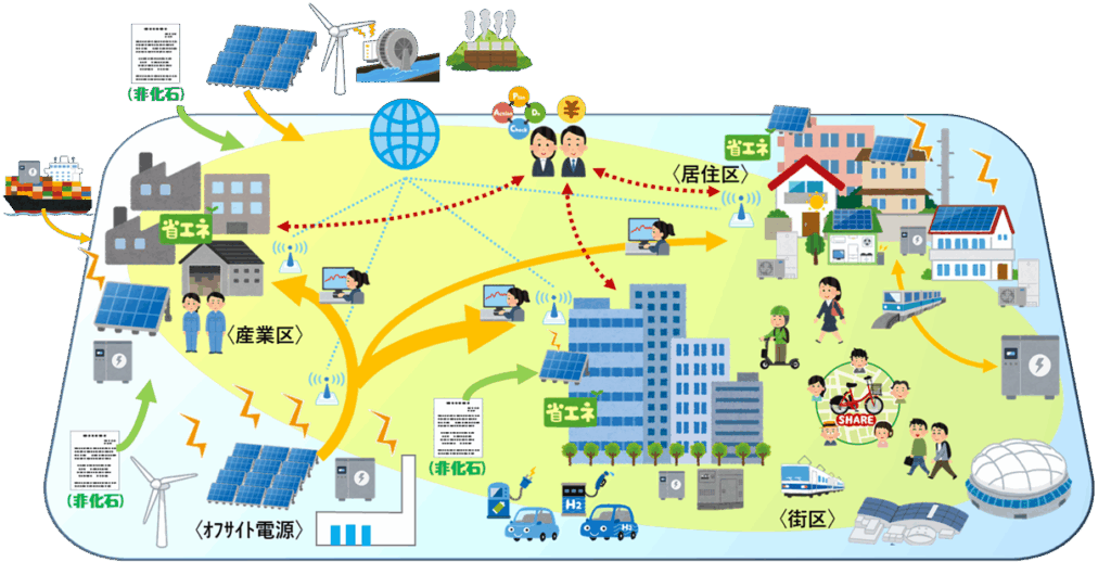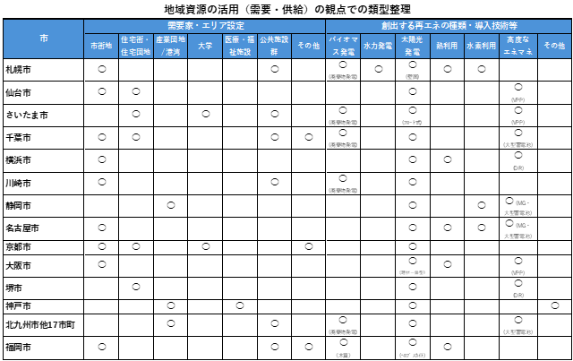 大都市における脱炭素化の取り組みを概観するには、対象エリアの特性別に整理した方が一般化のイメージもしやすいと思います。以下、各都市の計画提案書をもとに、対象エリアの区分(需要家の種類)別に取り組み内容を見ていきたいと思います。