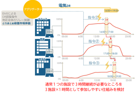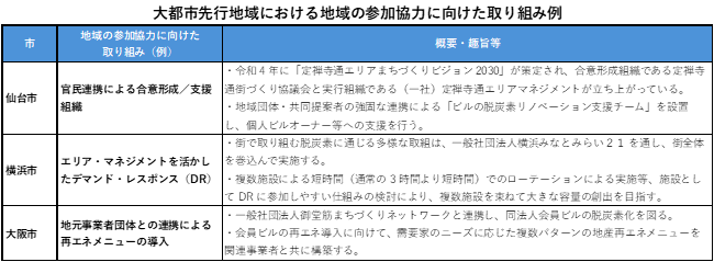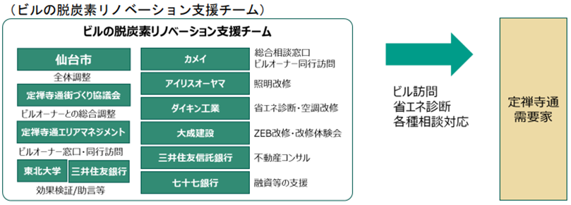 仙台市の共同提案者には、対象街区の地元協議会やエリアマネジメント法人のほか、機器メーカーやゼネコンなどが加わっています。そうした共同提案者で新たに編成する「ビルの脱炭素リノベーション支援チーム」による総合相談体制を整備することで、ビルオーナー等とのスムーズな意思疎通を図るとともに、本市独自の支援策も効果的に講じながら ZEB 改修や省エネ改修と併せたリノベーション等の創出を促進することが可能としています。また横浜市では、街区一帯を取りまとめるエリアマネジメント法人が共同提案者となり、再エネ創出が難しい街区での対策としてデマンド・レスポンス(DR)の実施に取り組むとしています。特に、個々の需要家では対応しづらい点に対応できるよう、複数施設による短時間(通常の3時間より短時間)でのローテーションによる実施等、施設としてDRに参加しやすい仕組みの検討を行うとしています。