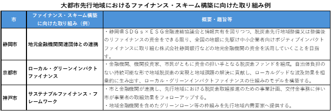 各都市とも、地元金融機関との連携などを進めていますが、静岡市では既存の金融連絡協議会との情報共有、京都市では多様な主体が参加する独自の脱炭素ファンドの組成、神戸市ではグリーンローン等の枠組みを需要家に提供する、といった取り組みが見られます。