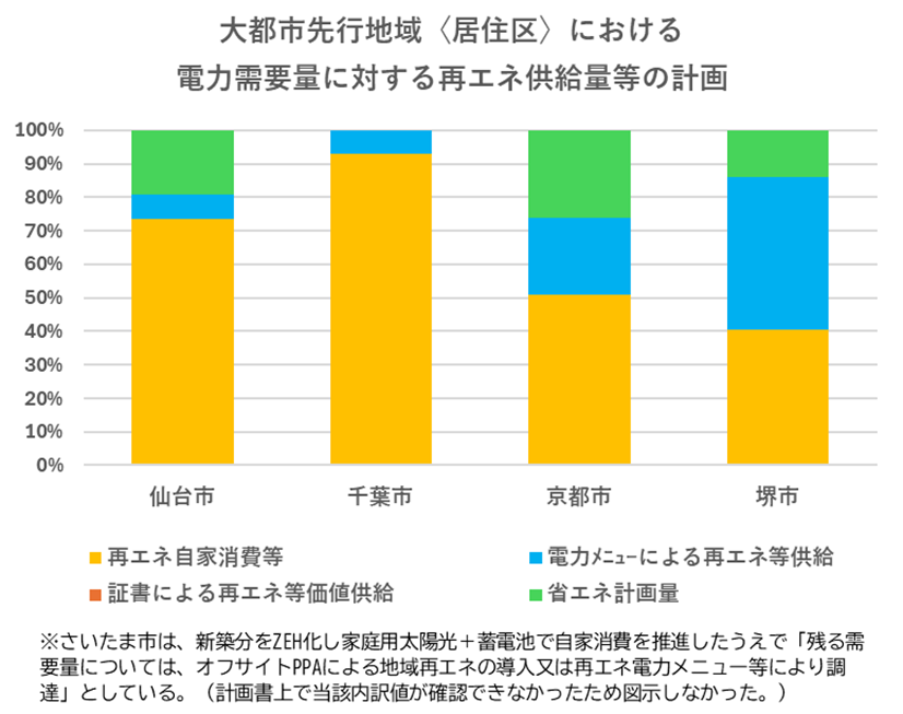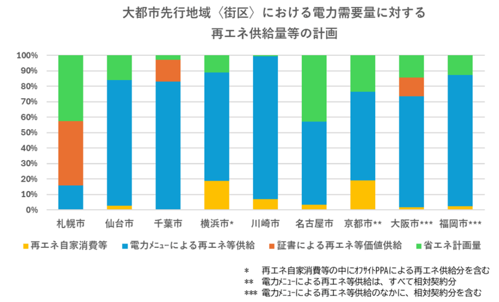 大都市における市街地(以下、街区)は、相対的に建物の立地密度が高く人々の往来も多く、エネルギー需要も大きいことから、エネルギー需要に対して十分な供給を域内で確保しにくい特性があるといえます。各都市の街区における電力需要量に対する再エネ供給量等の計画を見ると、区域内再エネの自家消費等はその多くが1割以下であり、多くの都市で電力メニューによる再エネ等の供給が最も大きな割合を占めています。