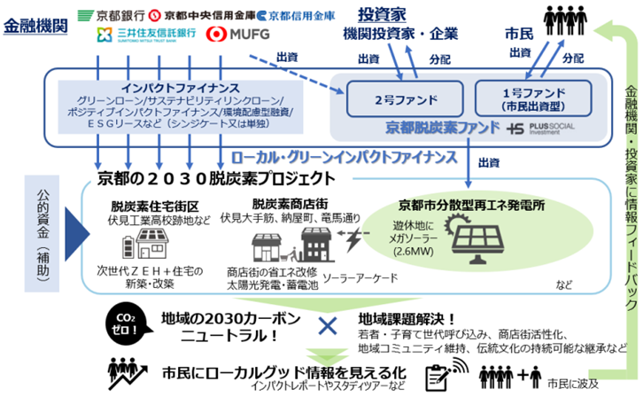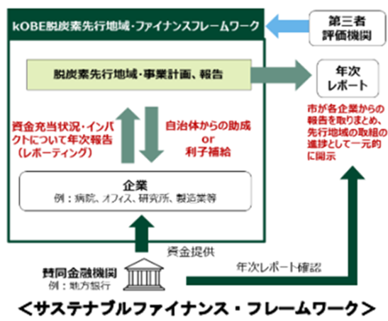 特に京都市では、地元金融機関や大手メガバンクなどの参画により、自前のファンド(京都脱炭素ファンド)を組成し、民ベースで資金を回すローカル・グリーンインパクトファイナンスを構築することで、長期的かつ大規模な脱炭素事業の実行力として、企業への融資や市民向けの住宅ローンの提供等、資金供給が円滑に行われる体制を整備するとしています。また神戸市では、設備投資をする需要家に対して、第三者評価機関に評価を得た信頼性の高いグリーンローン等の活用につなげるとともに、フレームワークに地域金融機関の参画を促すことで、脱炭素投資に対する融資機会の創出や、取引先企業に対する脱炭素投資の働き掛けなど機運醸成が進むことも見込んでいます。