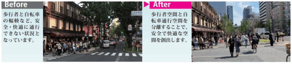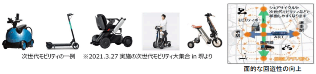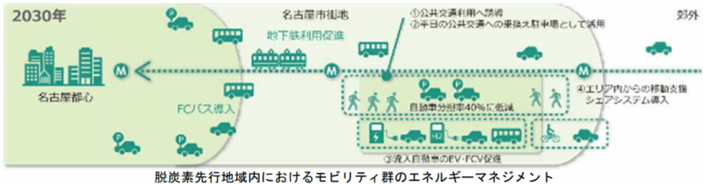 そのほか〈街区〉ならではの取り組みとして注目されるのは、人の往来の多さを生かしたモビリティ関連の脱炭素化があります。各都市では、施設関係の脱炭素化と並行して、EV充電設備等の設置、EVやFCV・水素バスの拡大、シェアリングシステムの導入、パーソナルモビリティ等の導入・実証などが計画されています。なかでも名古屋市や大阪市、堺市では、街区内への自動車流入規制や公共交通機関への誘導、ひと中心のストリート形成に向けた側道の歩行者空間化、周遊性の向上やウォーカブルな都市空間の形成などに並行して取り組むこととされており、大都市〈街区〉ならではの街づくりの一環として注目されます。