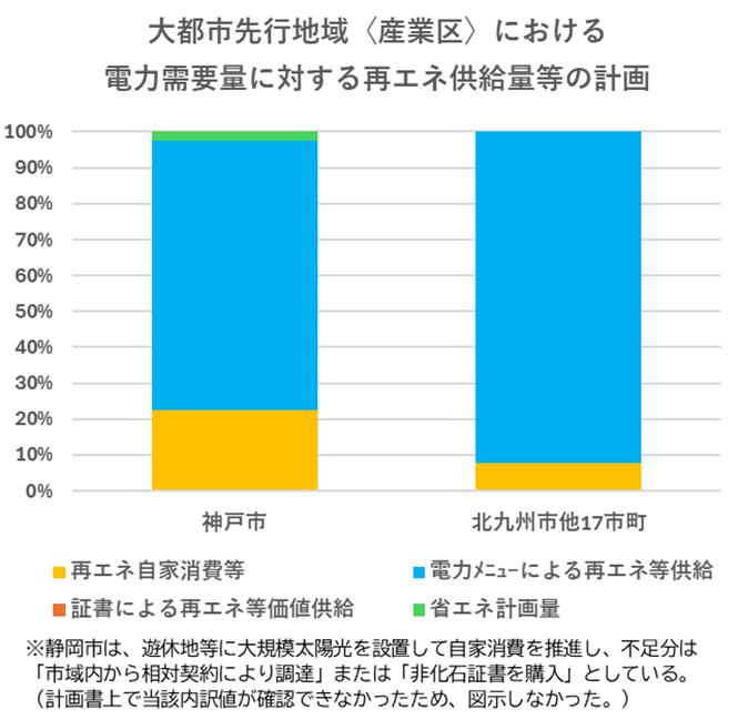 大都市における産業団地・港湾(以下、産業区)として類型されたのは、静岡市、神戸市及び北九州市他17市町で、いずれも各都市の湾岸エリアを対象としています。電力需要量に対する再エネ供給量等の計画を見ると、再エネ自家消費等の割合は1~2割とされており、産業区においても場所によっては電力需要量に対する発電施設設置スペースが限られている状況がうかがえます。