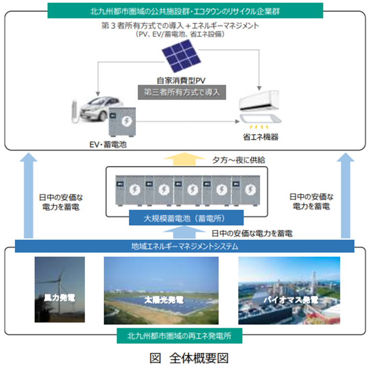 北九州市においては、料金体系に独自の“総括原価型PPA注)”を採用した“低コスト型第3者所有モデル”を採用し、各施設へのPV・EV及び蓄電池を迅速に導入するとしている点が特徴的です。さらに、エリア内に大規模蓄電池を整備し、洋上風力や廃棄物発電などの大規模発電電力と公共施設群を含む需要家との一体的なエネルギーマネジメントも構想されていることも大都市型のCEMSとして注目されます。
