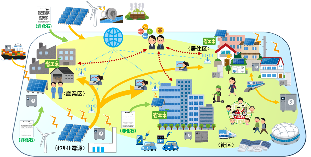 北九州市においては、料金体系に独自の“総括原価型PPA注)”を採用した“低コスト型第3者所有モデル”を採用し、各施設へのPV・EV及び蓄電池を迅速に導入するとしている点が特徴的です。さらに、エリア内に大規模蓄電池を整備し、洋上風力や廃棄物発電などの大規模発電電力と公共施設群を含む需要家との一体的なエネルギーマネジメントも構想されていることも大都市型のCEMSとして注目されます。